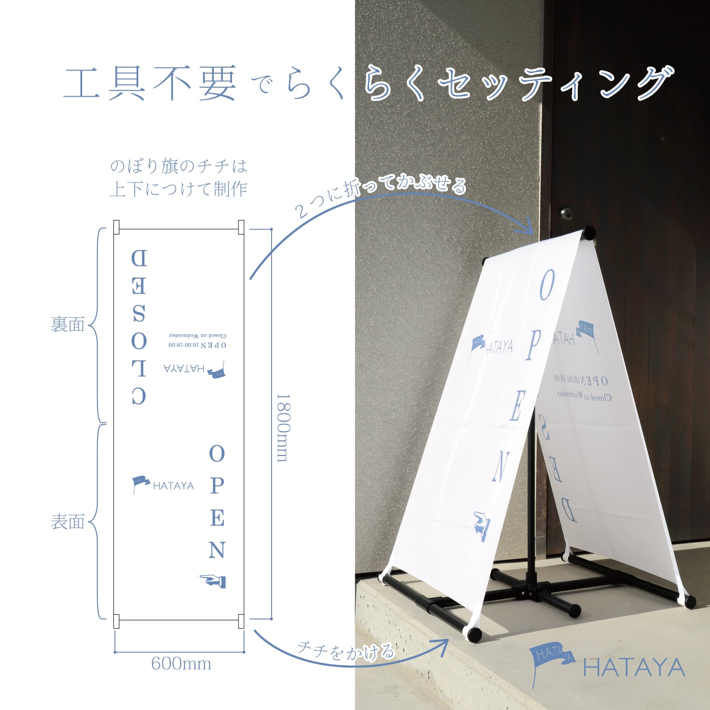 のぼり生地を使った看板は、かろやかな印象があり、屋内 屋外どんな場所においてもおしゃれ!